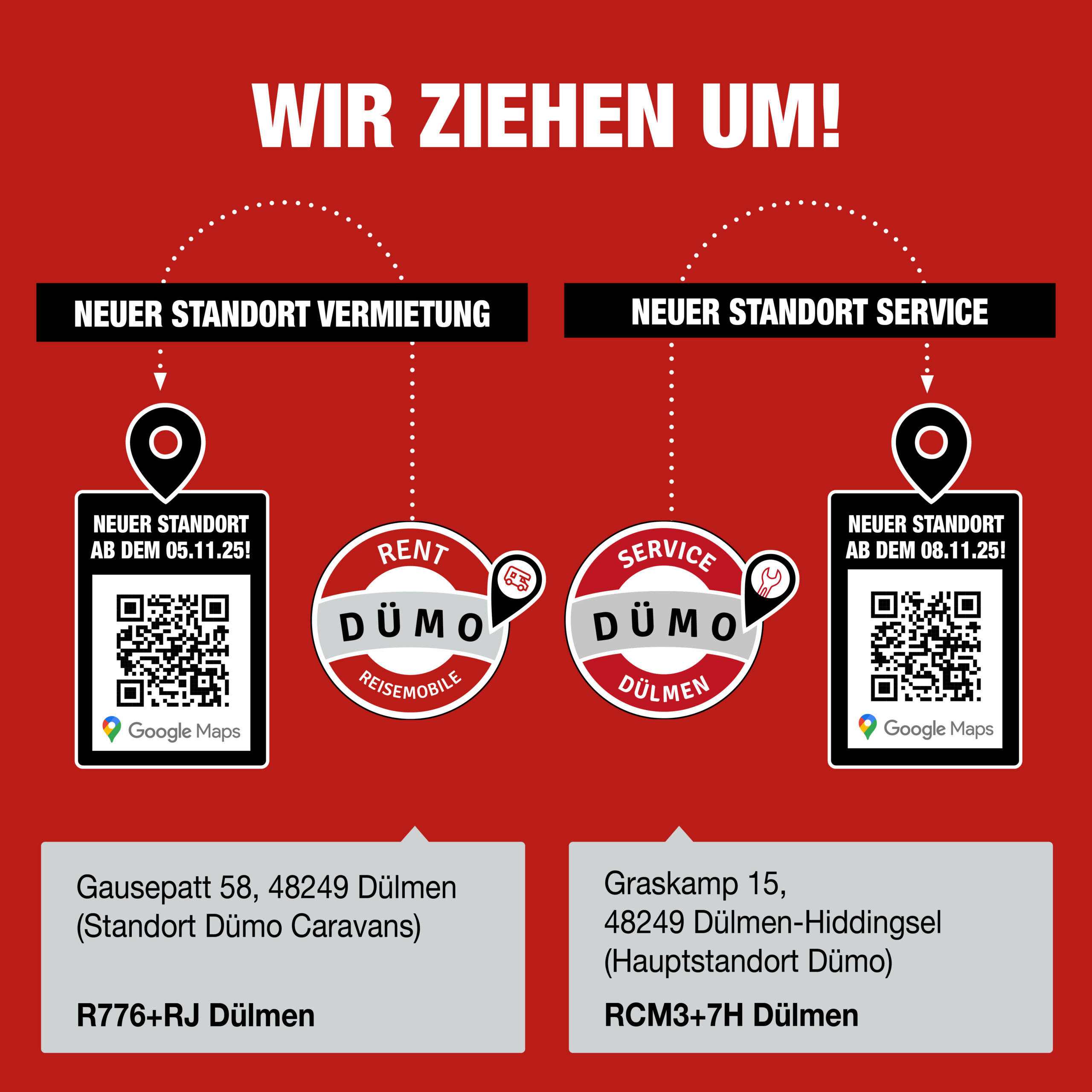Ab dem 05.11.2025 finden Sie Dümo Rent, Ihr Wohnmobilvermietung, am Standort: 📍 Dümo Caravans, Gausepatt 58, 48249 Dülmen