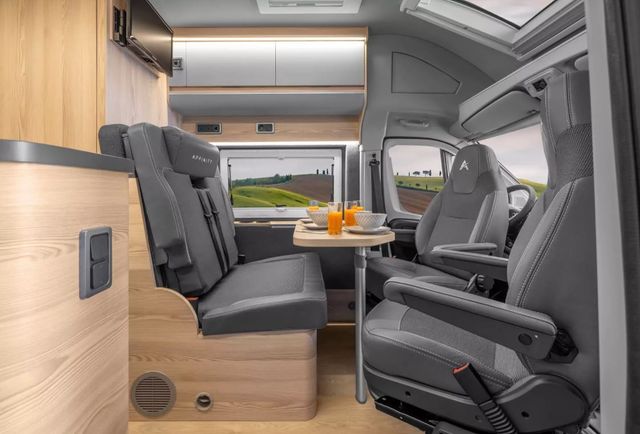 Affinity Three ist ein Wohnmobil, das für eine Familie 2 Erwachsene und 1 Kind ausgelegt ist. Der Innenraum von Affinity Three bietet den Nutzern die Möglichkeit, auch auf langen Fahrten bequem zu funktionieren. Die geraden Linien der Hängeschränke und die Platzierung des Kühlschranks und des Kleiderschranks unterhalb der Sichtlinie vergrößern den Innenraum optisch und vermitteln das Gefühl von mehr Raum.