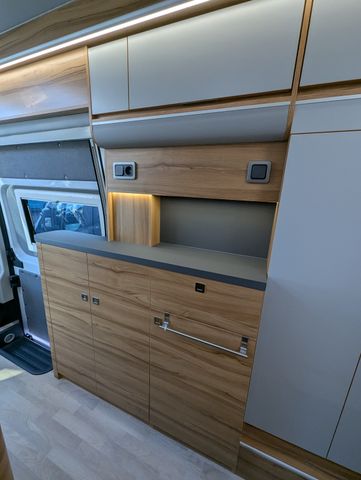 Französisches Bett mit regulierbarem Kopfende, Warmluftheizung mit Boiler Truma Combi, Doppelboden, Fahrerhausverdunklung, Elektrische Eintrittsstufe (70 cm), Insektenschutz Plissee für Seitenschiebetür, Wireless Ladegerät, Dachfenster mit elektrischem Ventilator im Bad, Dachfenster mit elektrischem Ventilator in der Küche
