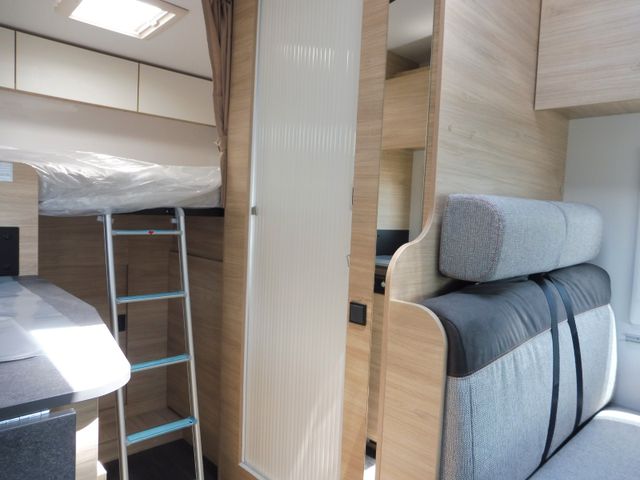 Doppelverglasung mit Kombirollos, Thermo-Innenrollos im Fahrerhaus, USB-Anschluss, IRP-Struktur: Polyester (GFK) -Boden, -Wände und -Dach, Bodenstärke 64 mm, Stahlfelgen mit Radkappen 16" grau, TV-Vorbereitung, Dieselheizung während der Fahrt benutzbar, Vorbereitung Solarpanel, Vorverkabelung Rückfahrkamera
