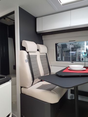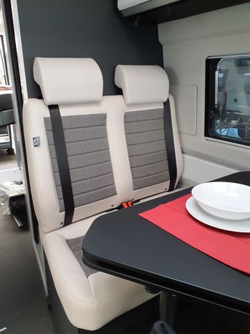 Polster "Arno", Airbag Fahrer+Beifahrer, ABS, ASR, ESP, EBD, HBA, LAC, MSR, Hillholder, Traction+ (ab 3500kg), Tagfahrlicht, Klimaanlage FH, Außenspiegel elek. verstell- und beheizbar, Fensterheber FH elek., FunkZentralverriegelung FH, Tempomat, dreh- und höhenverstellbare Komfort-FH-Sitze mit Armlehnen im Wohnraumdesign, Stopp-Start-Automatik (ab 3500kg), Getriebe manuell (6+R), 16"-Räder (ab 3500kg), ReifenReparaturset, Stopper an Schiebetür, AGM-Wohnraumbatterie 100Ah, Dusche, Cassetten-Toilette mit elektrischer Spülung,