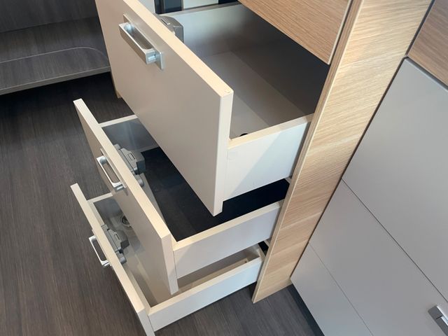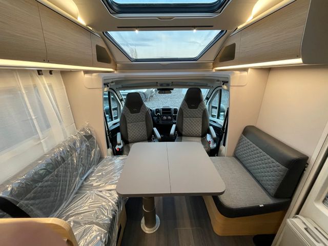 Polster "Arno", Airbag Fahrer+Beifahrer, ABS, ASR, ESP, EBD, HBA, LAC, MSR, Hillholder, Tagfahrlicht, LED-Rücklicht, Klimaanlage FH, Außenspiegel elek. verstell- und beheizbar, Fensterheber FH elek., Funk-Zentralverriegelung FH, Tempomat, dreh- und höhenverstellbare Komfort-FH-Sitze mit Armlehnen im Wohnraumdesign, Frontantrieb, 16"-Räder, Reifen-Reparatur-Set, Frontstoßfänger lackiert in FH-Farbe, Wohnraumfenster mit Rahmen, Funktions-Doppenboden, AGM-Wohnraumbatterie 100Ah, Ladestation 230V/12V in Garage, Sicherheits-Gasregler MonoControl CS, Dunstabzug, Abdeckung Kocher, Abtropfschale, Cassetten-Toilette mit elektrischer Spülung