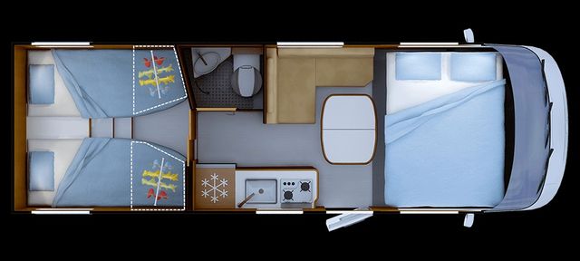 Badezimmer DUO'SPACE für optimierten WohnraumSchwarzer DuschrostEinzelbetten (80 x 199 cm + 80 x 185 cm) in großes Querbett umwandelbarKleiderschränk am Fußende der Betten leicht zugänglichFeste Trennwand Tag/NachtKompressionskühlschrank 140 LNirostastahl-Kochstelle mit 2 Flammen, schwarzen Deckeln und Piezo-ZündungWohnraum mit L-förmiger SitzbankIn Zusatzbett umwandelbarer Wohnraum 1 PlatzKlapptischDurchgehende Garage mit GfKWanneGroße Garagentüren rechts und links 100 x 75 cmSonderausstattung:
