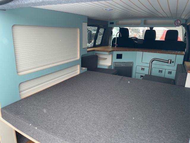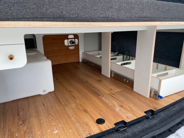 Möbelzeile L aus Sperrholz mit Echtholz Bambusarbeitsplatte