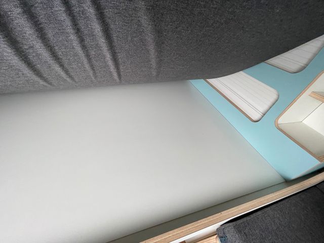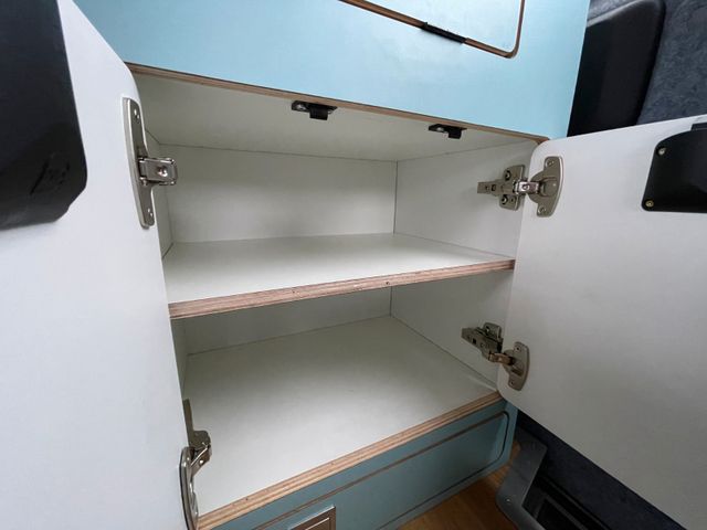 Großer Hochschrank im Heck mit Staufächern für Kleidung & Bettwäsche