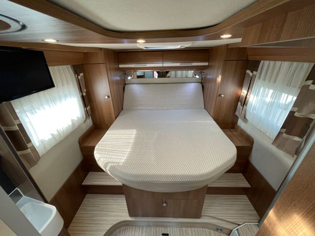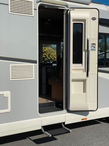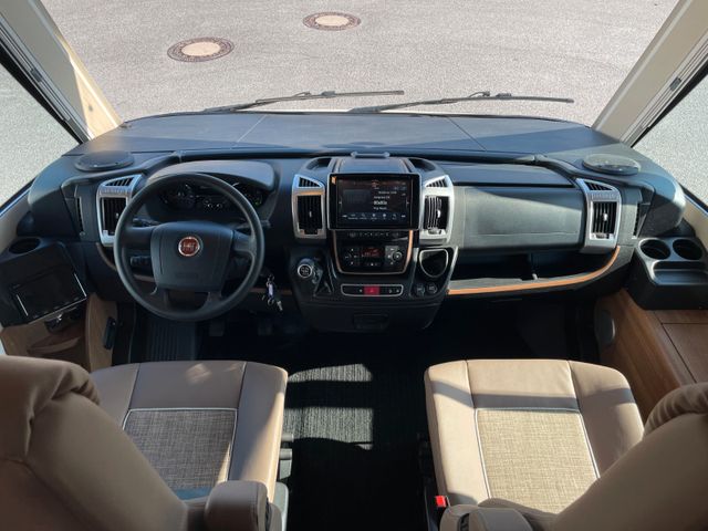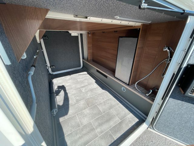 Das integrierte Reisemobil verfügt über ein Queensbett, Sitzgruppenumbau, Heckgarage mit zusätzlicher großer Tür, 4 m Markise, Außendusche, Solaranlage (300 W), zusätzliche Wohnraumbatterie und Wechselrichter 1000 W.