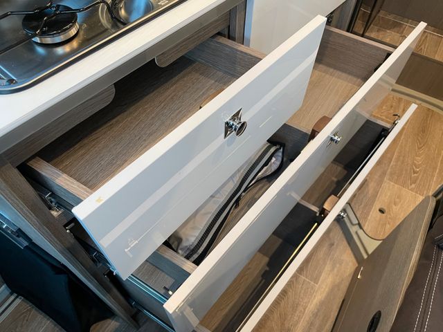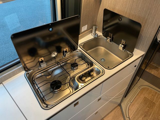 Küche & BordtechnikKühlschrank Slimtower 133 l (mit Frosterfach), Gas-Duo-Control CS, Elektrikpaket I & II (USB-/230 V-Steckdosen, Heck- und Stauraumbeleuchtung), Solar 240 Watt, Gaswarner, Reifendrucksensoren